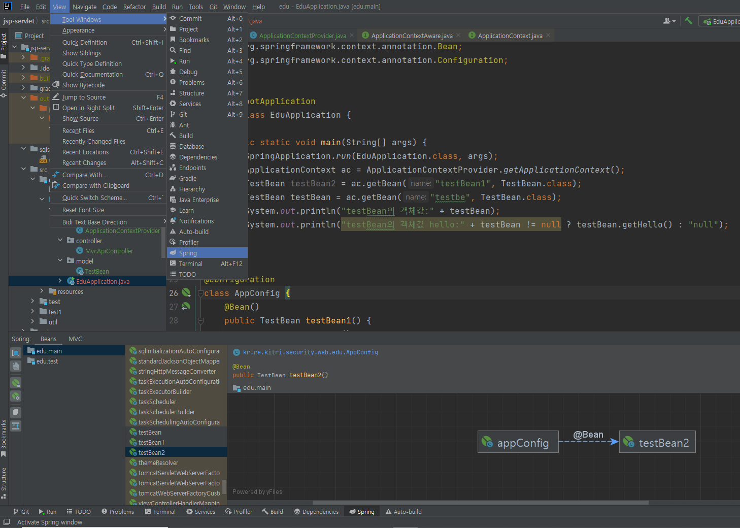 intellij에서 View>Tool Window>Spring 에 들어가면 Beans 에서 testBean이 저장되어 있는 것을 확인할 수 있다.