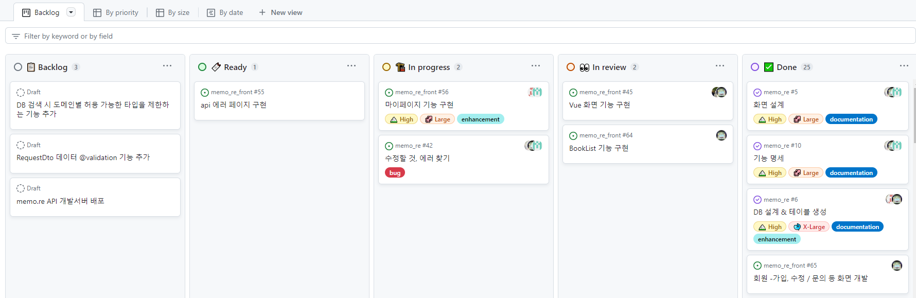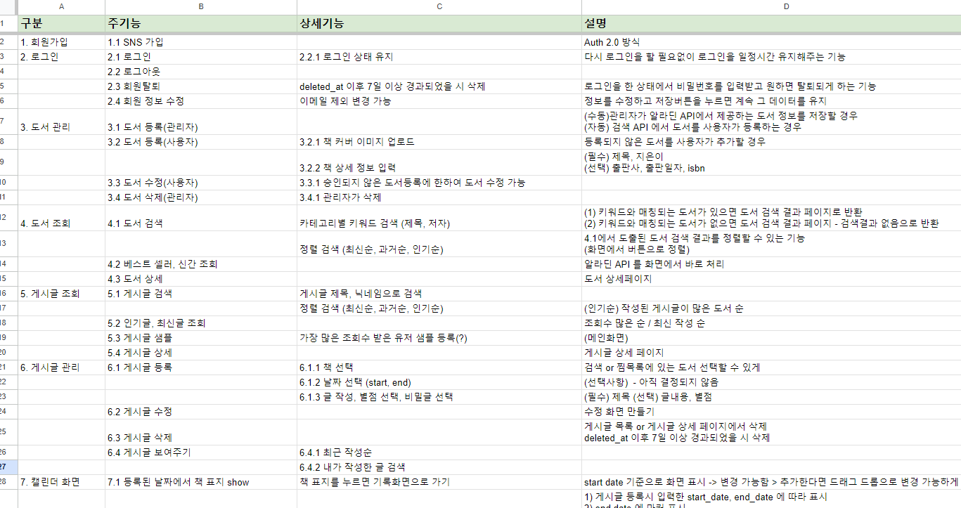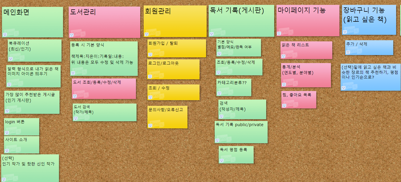 브레인 스토밍같이 포스트잇 기반으로 필요한 기능을 자유롭게 저장하고, 저장한 내용을 바탕으로 우선 순위를 정해서 기능 명세서를 작성했다.