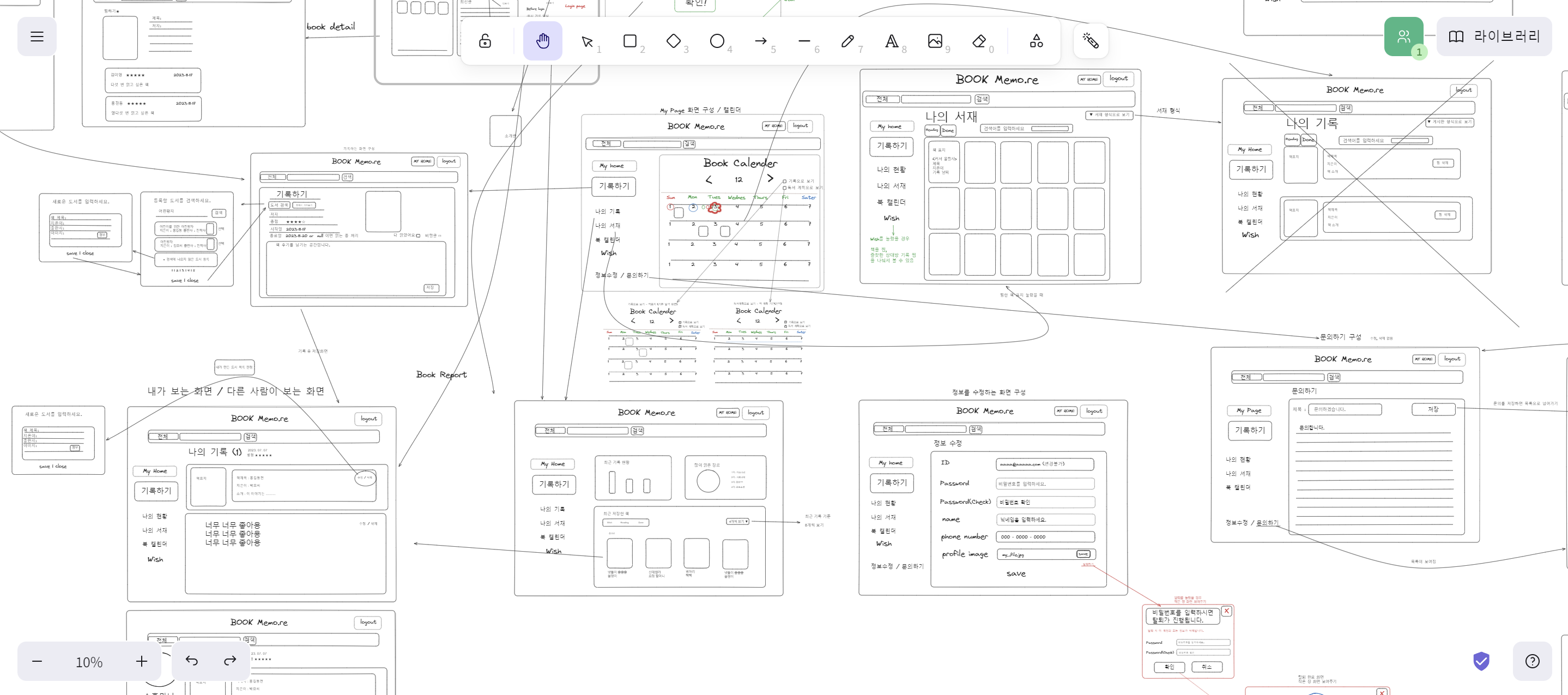 상세페이지와 구체적인 동작은 exclidraw를 활용했다. 심플하고 자유도가 높은 장점, 하지만 여러명이 동시 작업시에 오류가 많이 발생했다.